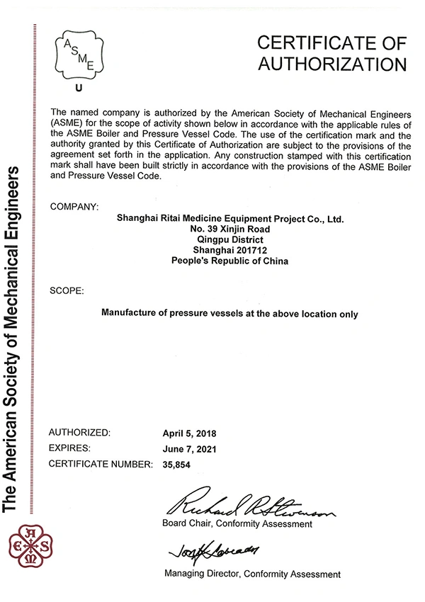 شركة Shanghai Ritai للمعدات البيولوجية ذات المساهمة المحدودة تخصصت شركة RITAI منذ تأسيسها في البحث والتطوير لمصافي الضغط المصنوعة من الفولاذ المقاوم للصدأ الصحية، والأوعية الصحية، والصمامات الصحية، وأنظمة الأنابيب الصحية، والتي تُستخدم على نطاق واسع في صناعات الكيمياء، والأدوية، والبيولوجيا، ومستحضرات التجميل، والأغذية. تفخر RITAI بكونها عضوًا في جمعية صناعة المعدات الصيدلانية الصينية وجمعية شنغهاي لإدارة المعدات الخاصة. نظام إدارة الجودة للشركة متجذر في ISO9001 ويحمل ترخيص التصنيع لأوعية الضغط من الفئة الأولى والثانية في جمهورية الصين الشعبية، بالإضافة إلى ختم ASME (U) الأمريكي.